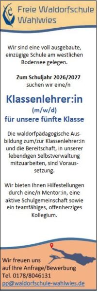 wir freuen uns, dass wir Ihr Interesse an unserer Schule geweckt haben. Als voll ausgebaute einzügige Schule am westlichen Bodensee gelegen haben wir regelmäßig Bedarf an engagierten Lehrer:innen. Zögern Sie also nicht, uns Ihre Initiativbewerbung (an pp@waldorfschule-wahlwies.de) zukommen zu lassen. Vorab können Sie sich auch gerne telefonisch bei Frau Hintz informieren (Tel. 07771/921 199 oder 0178/804 61 31).